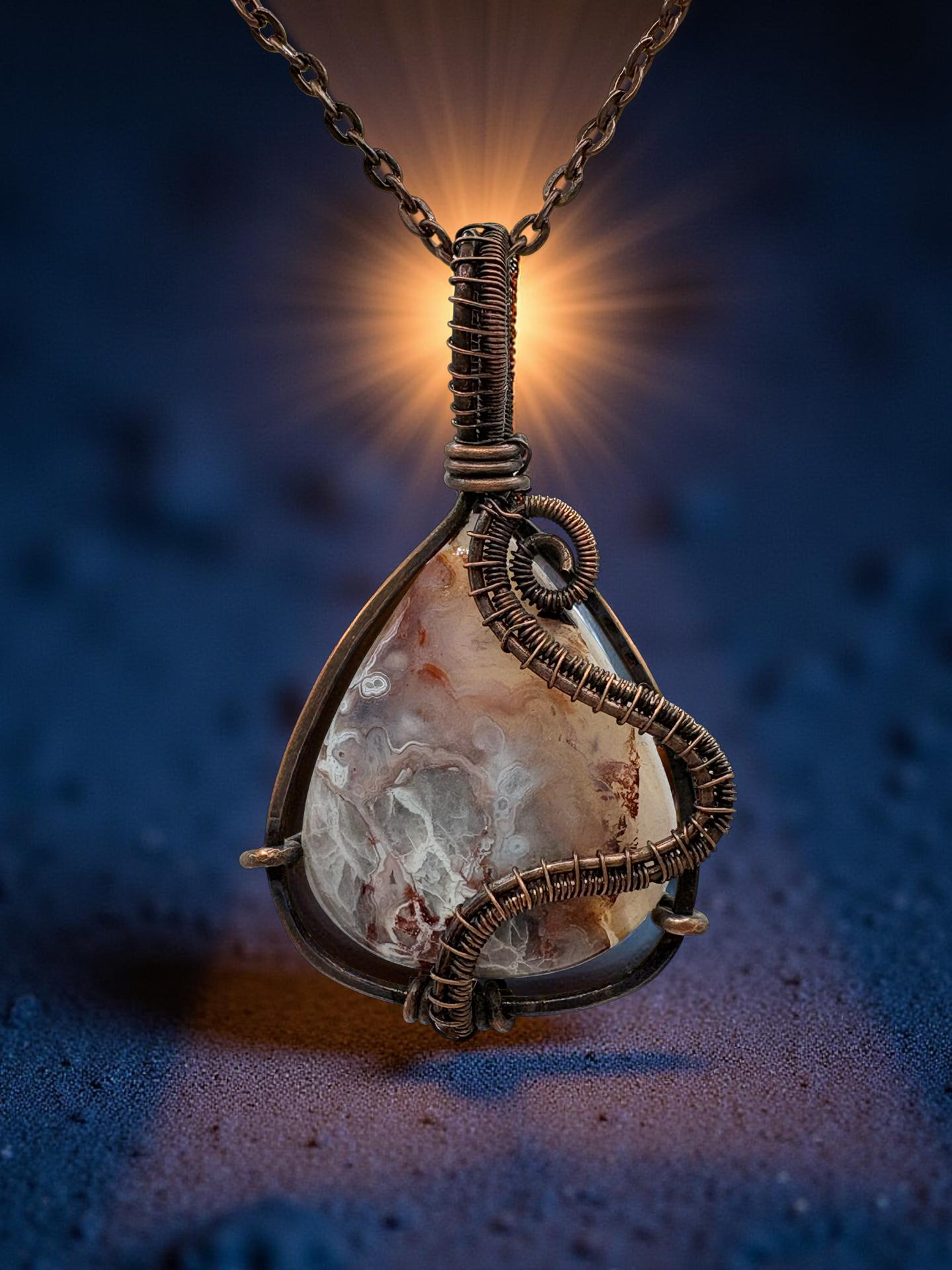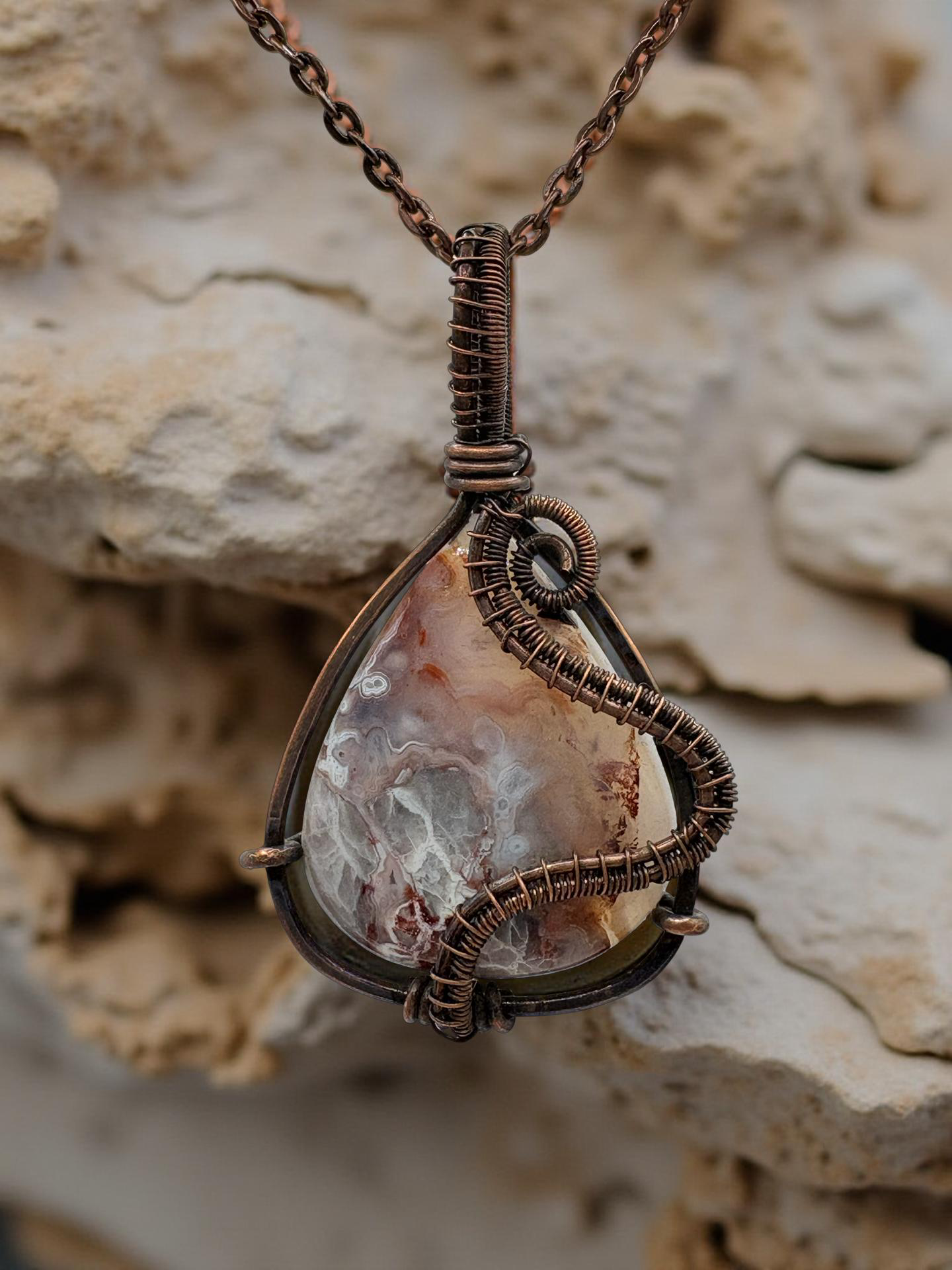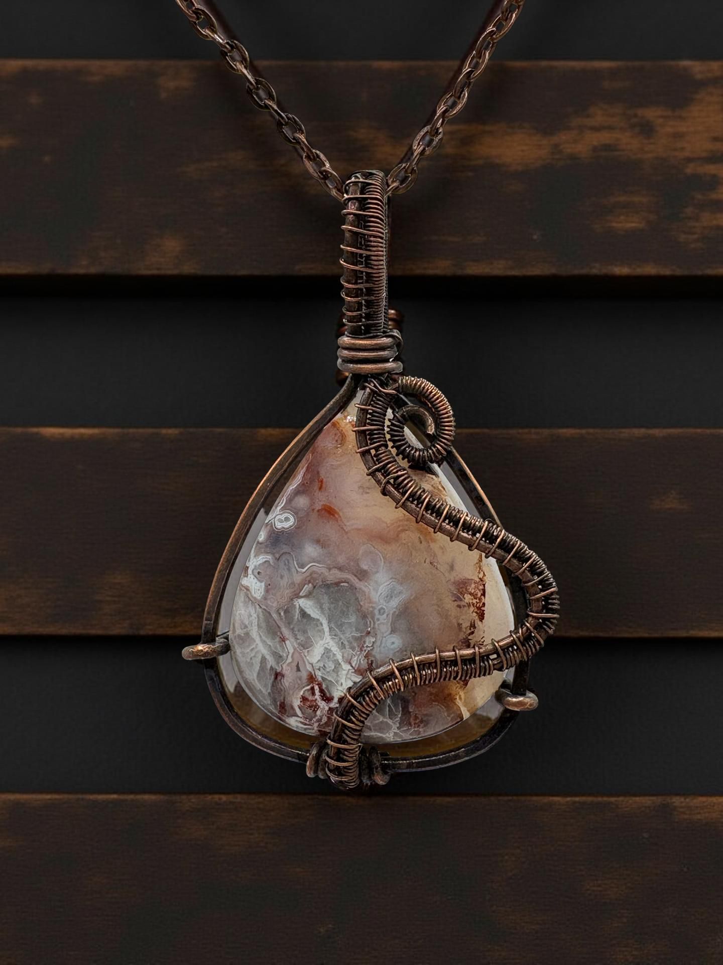 Earthy, organic, and full of soul—this handcrafted pendant features a gorgeous teardrop agate, wrapped in warm copper wire with intricate, free-flowing weaves. The natural patterns within the stone create a dreamy landscape, making this piece truly one-of-a-kind.