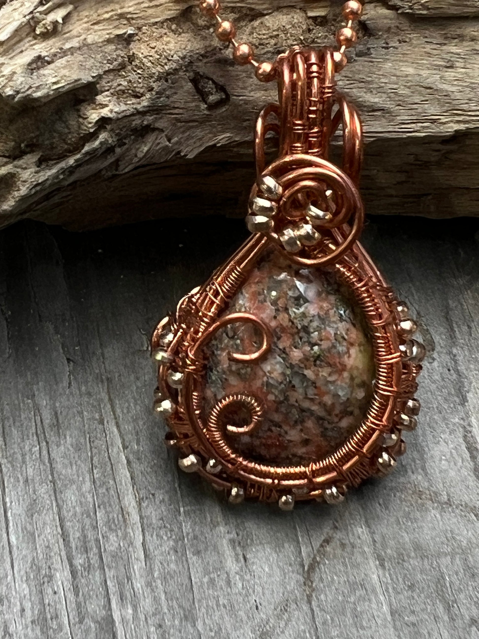 Embrace timeless boho elegance with this handcrafted necklace, featuring warm copper wire wrapping that flows organically around a stunning stone centerpiece. Delicately accented with mixed metal beads, each detail catches the light in its own unique way, creating a perfect balance of rustic charm and refined sophistication. Whether layered for a festival vibe or worn solo as a statement piece, this necklace is a versatile treasure that brings artful beauty to any outfit.