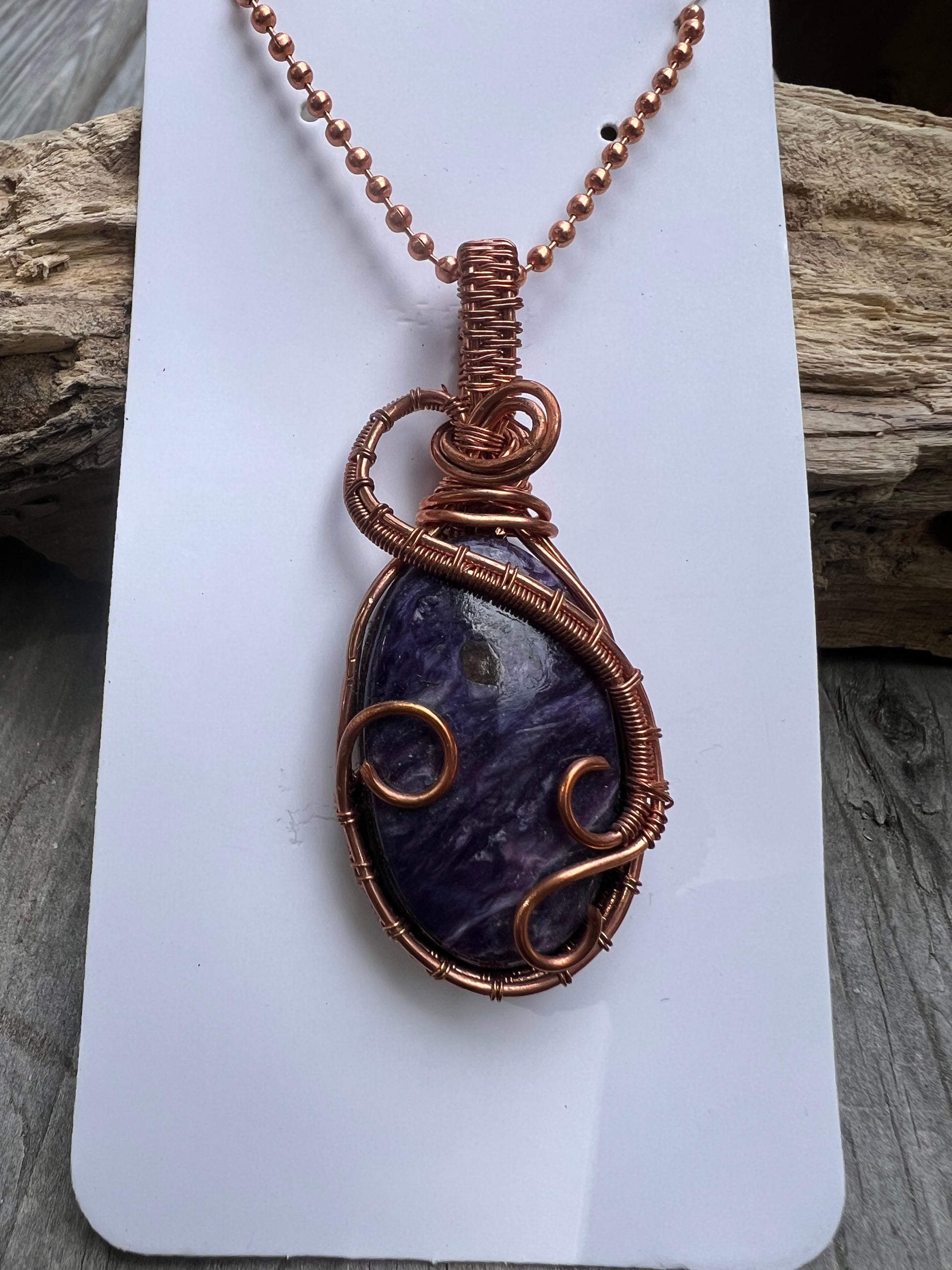 The Mystic Dreams Pendant features a stunning piece of Charoite, hand-wrapped in warm copper wire with graceful swirls and detailed weaving. Copper’s earthy glow enhances the stone’s natural vibrancy, making this pendant a one-of-a-kind blend of simplicity and beauty.